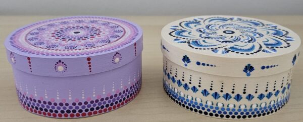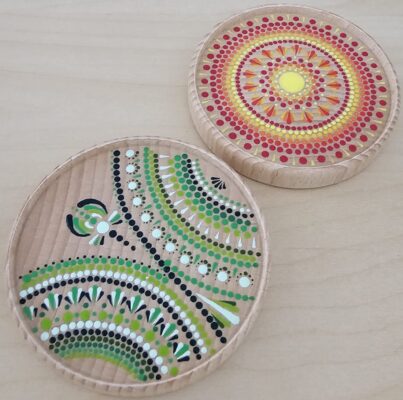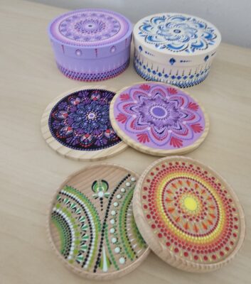 Am zweiten Tag werden die Dotting-Techniken weitergeführt und auf Holzobjekte angewendet. So entsteht ein natürlicher Übergang von der Übung zur Umsetzung auf einem neuen Material.