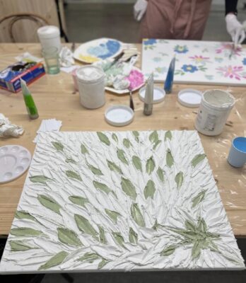 Im Fokus steht der Umgang mit dem Malmesser sowie das Erzeugen unterschiedlicher Farben, Oberflächen und Formen. Die Teilnehmenden lernen, wie durch verschiedene Spachtelbewegungen und Werkzeuge sowohl lineare als auch organische Strukturen entstehen.